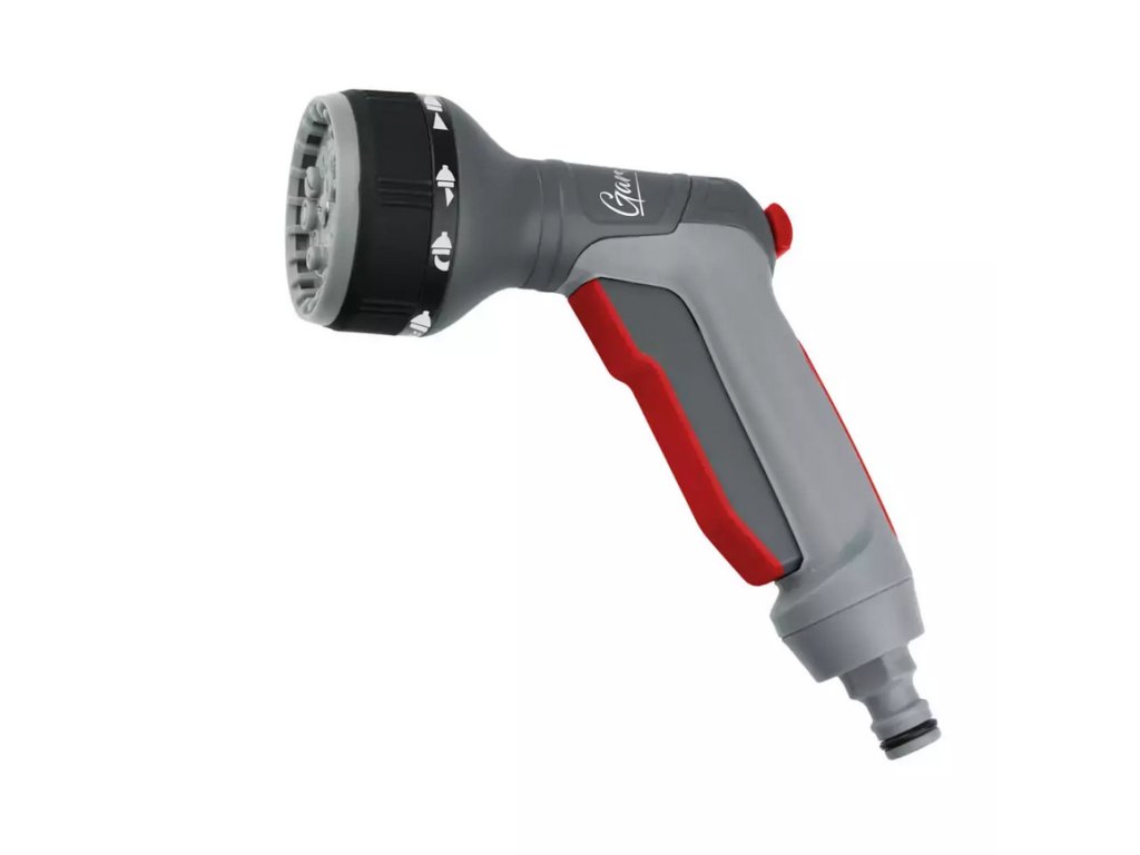 Striekacia pištoľ je riešením pre ľudí, ktorí hľadajú niečo viac ako obyčajný záhradný zavlažovač. Nastavovanie intenzity vody sa ovláda palcom, čo je veľmi pohodlné, najmä keď je druhá ruka obsadená. Vďaka funkcii rýchleho zastavenia môžete zablokovať uvoľňovaciu páku, aby ste si pri dlhodobom polievaní neunavili ruky. Pomocou kolieska vedľa trysky prepínate funkciu výberom požadovaných lúčov. Striekacia pištoľ ich má osem, od silného prúdu vody až po jemnú hmlu. Telo pištole je vyrobené z materiálu ABS s vložkami z mäkkého TPR materiálu. Rukoväť bola tvarovaná podľa tvaru ruky, čo zaisťuje vysoký komfort používania. Pripojenie pištole pre štandardnú 1/2" rýchlospojku