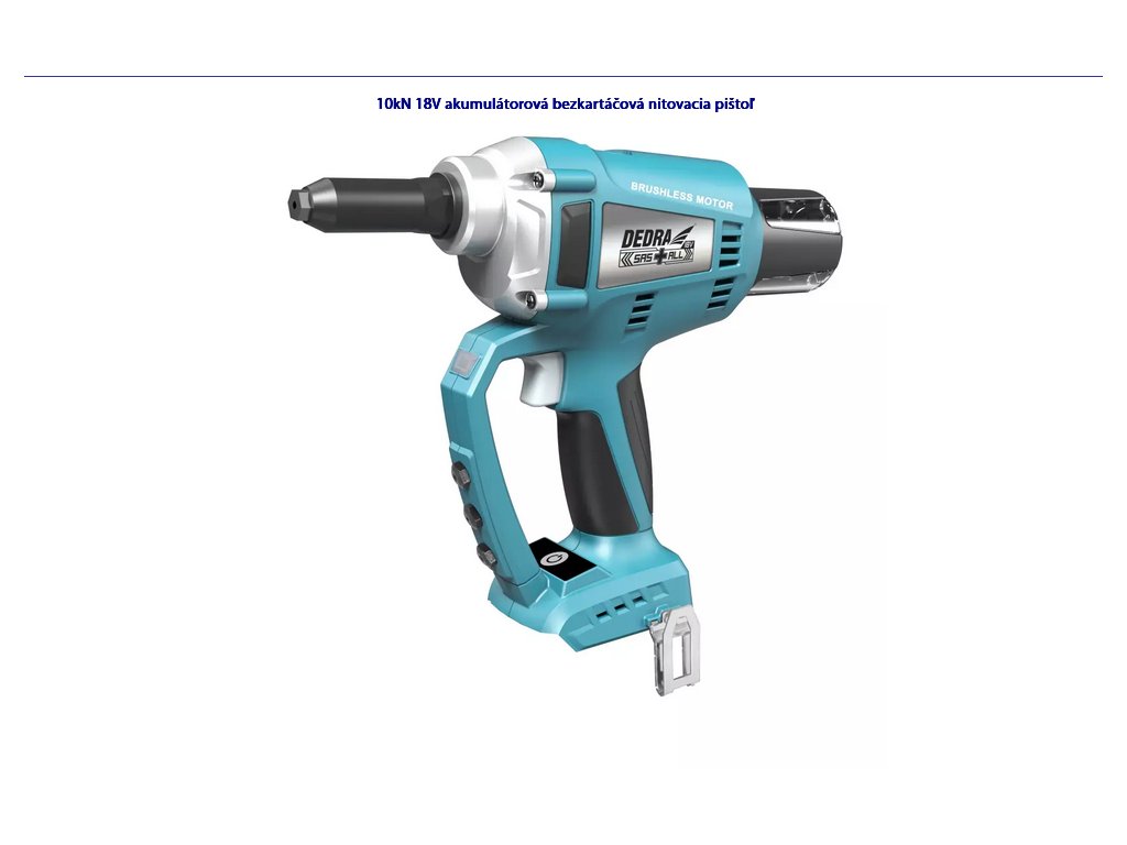Umožňuje rýchle a trvalé spojenie súčiastok nitovaním. Vymeniteľné hroty umožňujú zvoliť priemer nitu tak, aby vyhovoval konkrétnemu otvoru. Bezuhlíkový motor použitý vo výrobku, ktorého výhodou je oveľa vyššia účinnosť a odolnosť ako u tradičného uhlíkového motora, zaručuje dlhú životnosť výrobku.Vlastnosti akumulátorovej nitovačky DEDRA SAS+ALL DED7155: