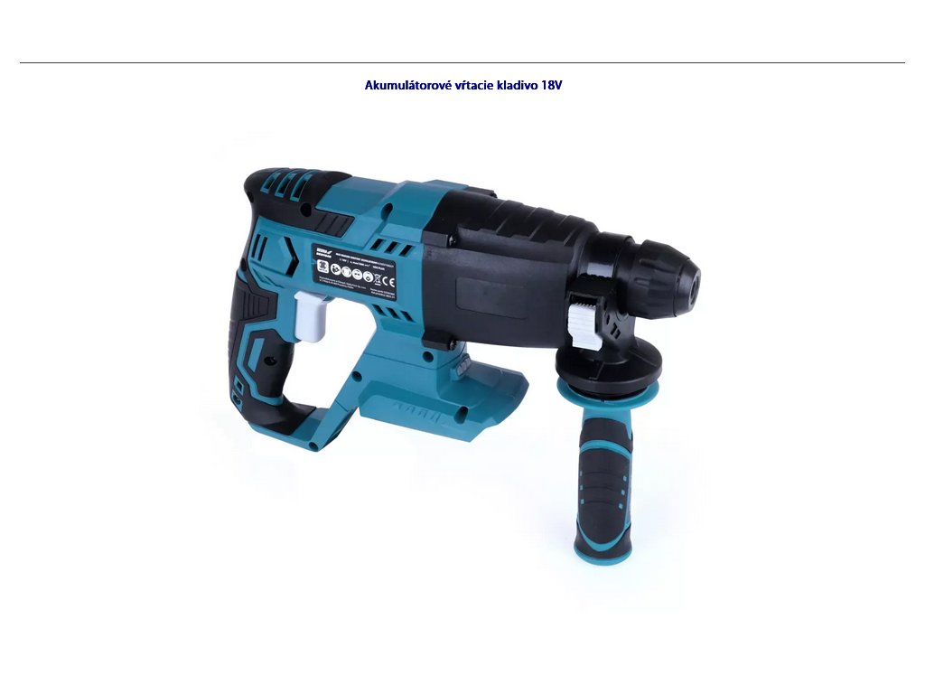 Tento výrobok je určený na vŕtanie otvorov do stavebných materiálov ako je betón, tehla, omietka atď. Bočným spínačom si môžeme zvoliť 3 prevádzkové režimy: vŕtanie, vŕtanie s príklepom, dláta a polohovanie dláta pre vertikálnu alebo horizontálnu prácu. Toto zariadenie má príklepovú energiu 1,8J, čo v kombinácii s vysokou frekvenciou príklepu (5500 úderov/min) postačuje na všetky typy renovačných a dokončovacích prác. Puzdro je vyrobené z nylonu s prímesou skleneného vlákna, vďaka čomu sa zvýšila odolnosť proti mechanickému poškodeniu a UV žiareniu. Ergonómiu a komfort práce zlepšujú nízka hmotnosť prístroja a pogumovaná rukoväť. Prídavné LED osvetlenie umožňuje precíznu prácu na podexponovaných, ťažko dostupných miestach.