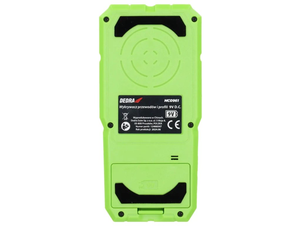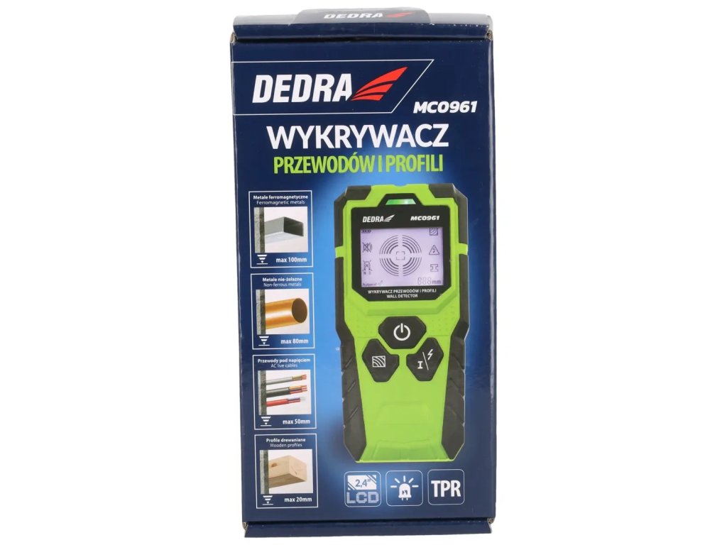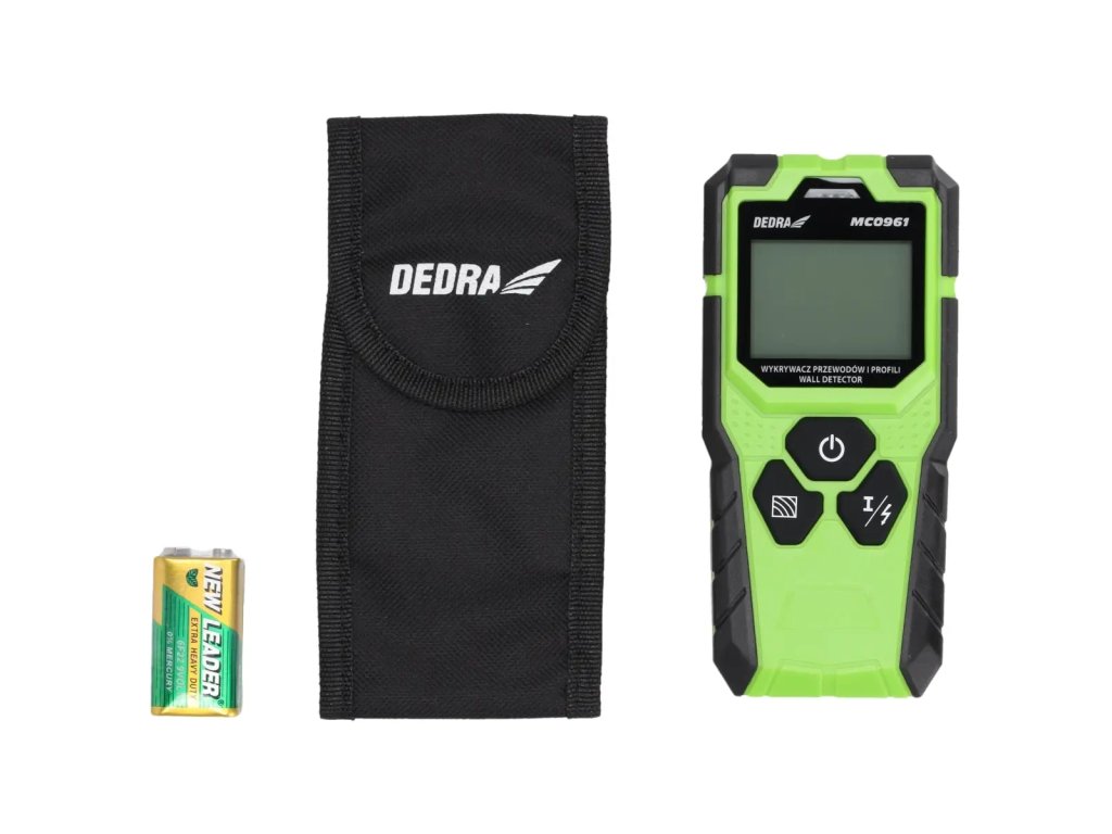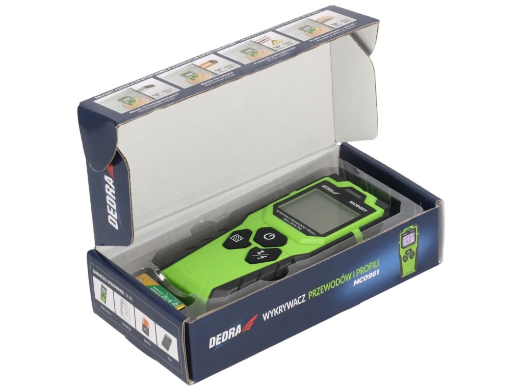 Displej: LED 2,4", typ detekovaných objektov: drevo/kov/feromagnetický kov/káble pod napätím, max. hĺbka detekcie pre drevené profily 20 mm, max. hĺbka detekcie vodičov pod napätím: 50 mm, max. hĺbka detekcie nezávislých kovov: 80 mm, max. hĺbka detekcie feromagnetických kovov: 100 mm, trieda ochrany: IP54, napájanie: 1x9V DC, pracovná teplota: -10+50 °C, teplota skladovania: -20+70°C