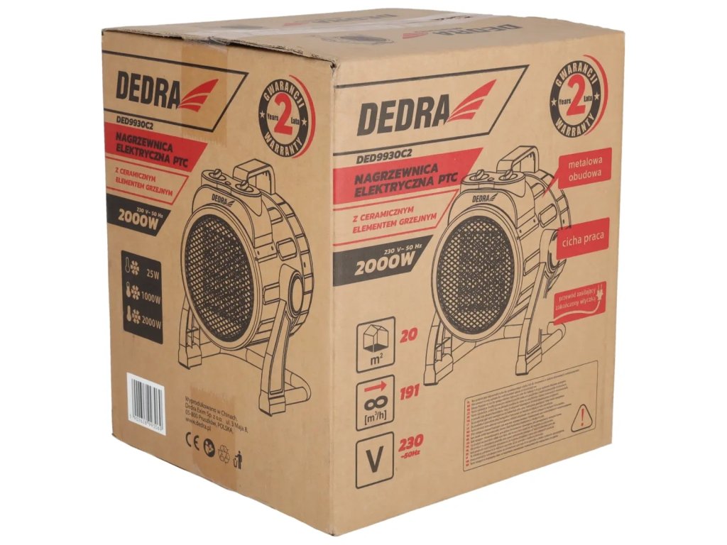 Výkon: 1000 W/2000 W; prietok vzduchu 197 m³/h; výstup 230 V; keramické vykurovacie teleso; ochrana proti prehriatiu; termostat; 3 prevádzkové režimy: chladný/teplý/horúci