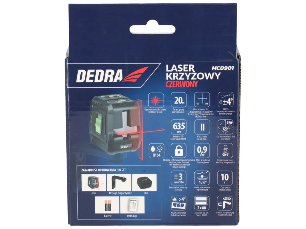 Výkon: 0,9 mW; dosah lasera bez detektora: 635Nm; presnosť samočinného nastavenia: Samonivelačný systém zámku: 1/4"; alarm odchýlky; samonivelačný systém zámku.