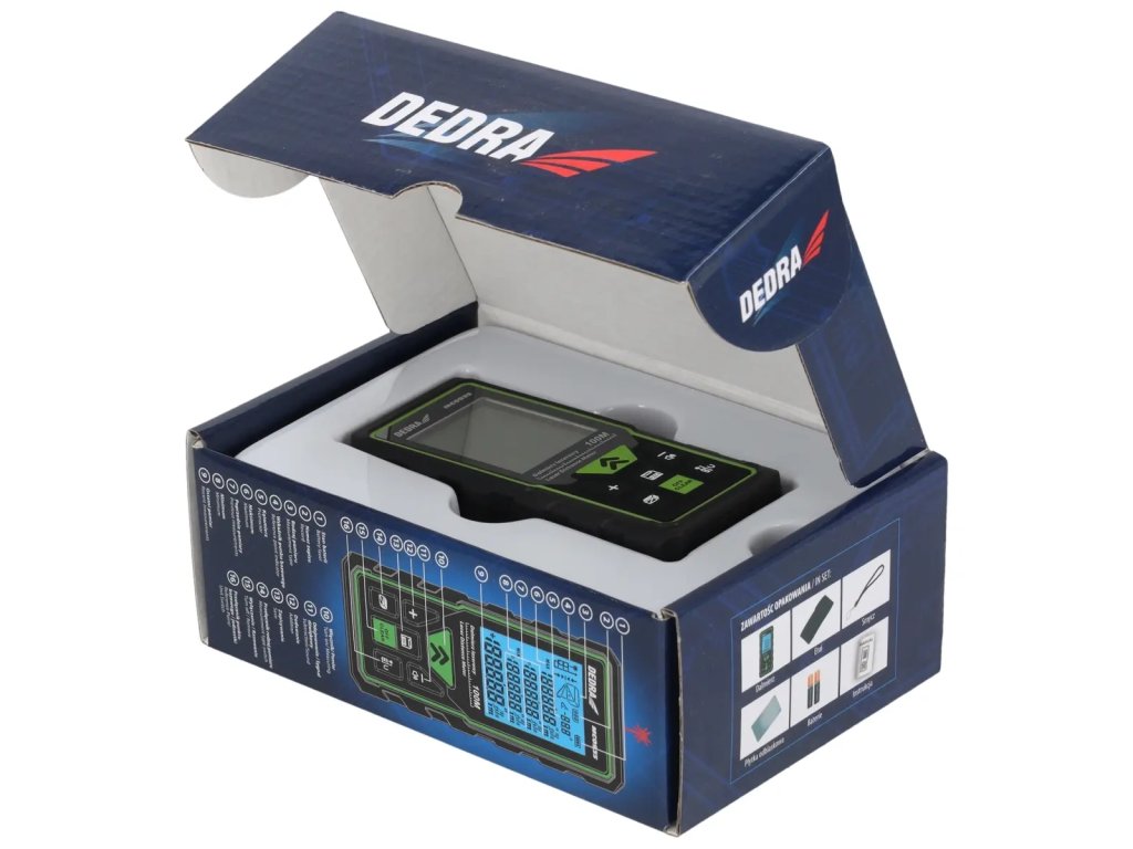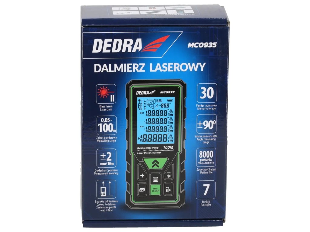 Dosah lasera: 50 m; rozsah merania: 0,05 m-50 m; vlnová dĺžka: 635 nm; presnosť: ±2 mm/10 m; výkon: <1 mW; 7 funkcií; 6-riadkový displej; presná optika; trieda lasera II