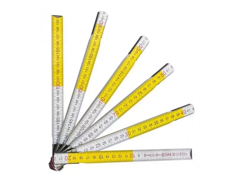 Skladacia, bielo-žltá stupnica, z javorového dreva, spájané pozinkovanými nitmi, trieda presnosti: MID III, dĺžka: 2 m