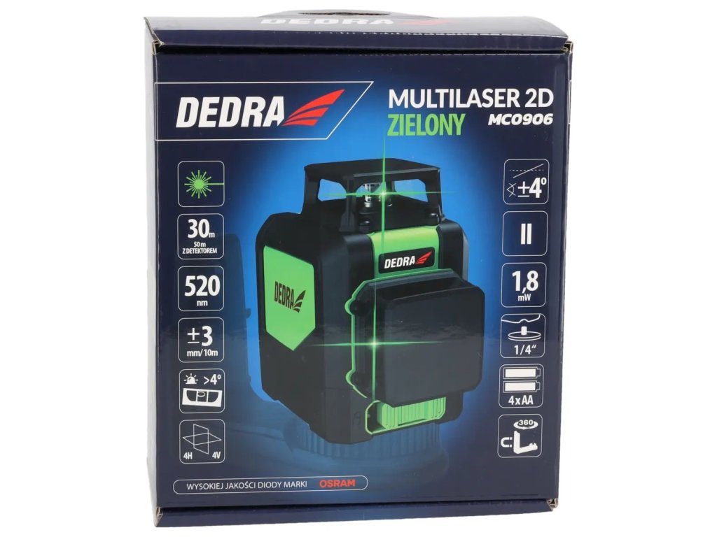 Výkon: 1,8 mW; dosah lasera: 30m (50m s detektorom); presnosť: ±3mm/10m trieda lasera: II; montážny závit: 1/4"; rozsah samonivelizácie: ±4°; alarm odchýlky; samonivelačný systém; dióda značky OSRAM