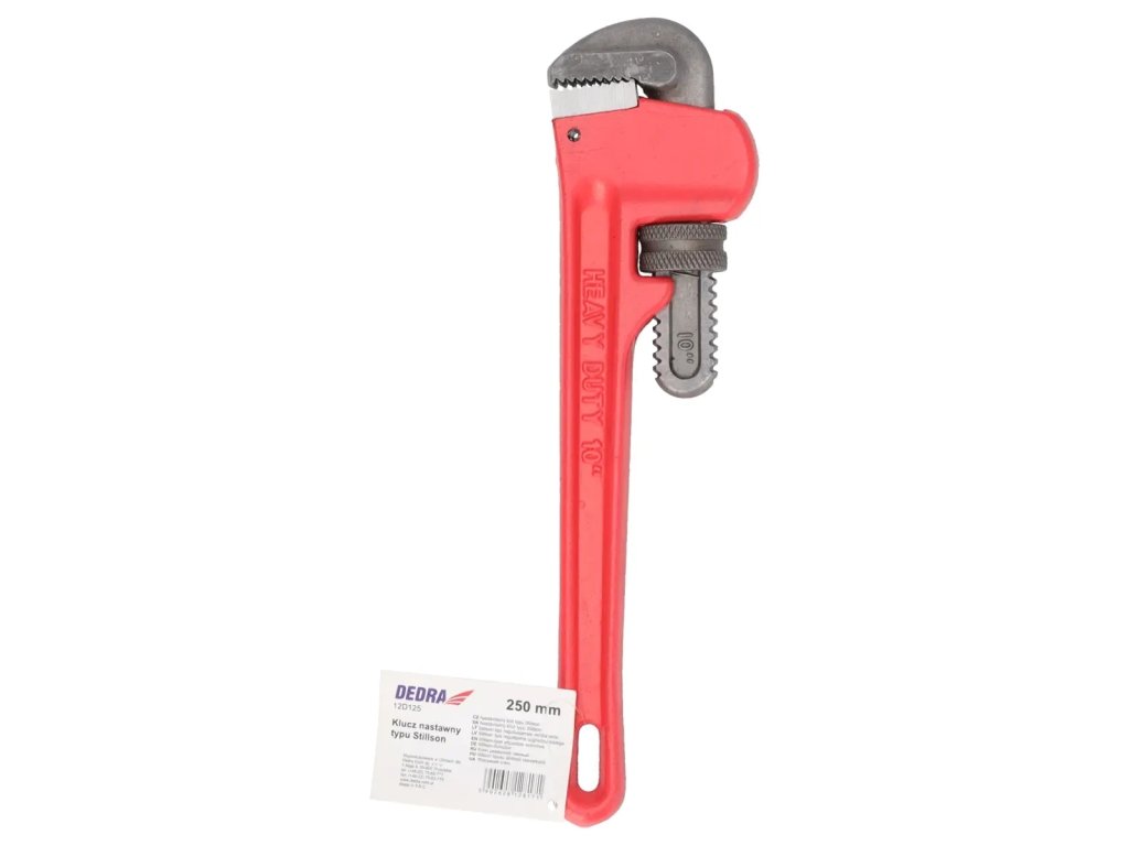 Materiál: nástrojová oceľ; kované a kalené čeľuste; vnútorná strana čeľustí s drážkami; gombík na nastavenie šírky čeľustí
