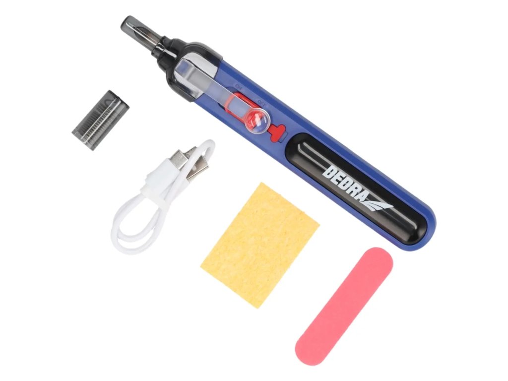 Napájanie: 4 V / 36 W, lítium-iónová batéria 4 V / 2000 mAh, čas zahrievania: 6s, prevádzkový čas: 40 min, čas nabíjania: 3-4 hodiny, maximálna teplota ohrevu: 450°C. Súčasťou balenia je: 25 mm kábel USB-C, 2,5 g spájkovacieho cínu ø1,0 mm, špongia na čistenie spájkovacieho hrotu, pilník na čistenie spájkovacieho hrotu