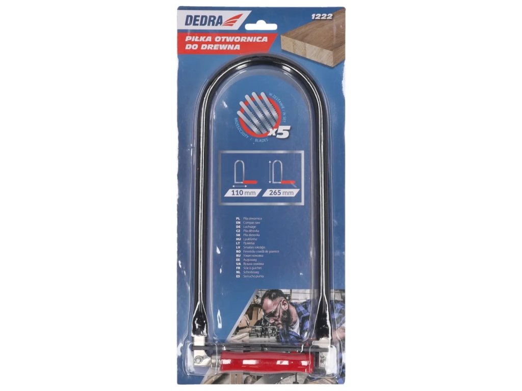 Dĺžka kotúča: 110 mm, výška píly: 265 mm, rukoväť z dreva, 5 pílových kotúčov súčasťou balenia