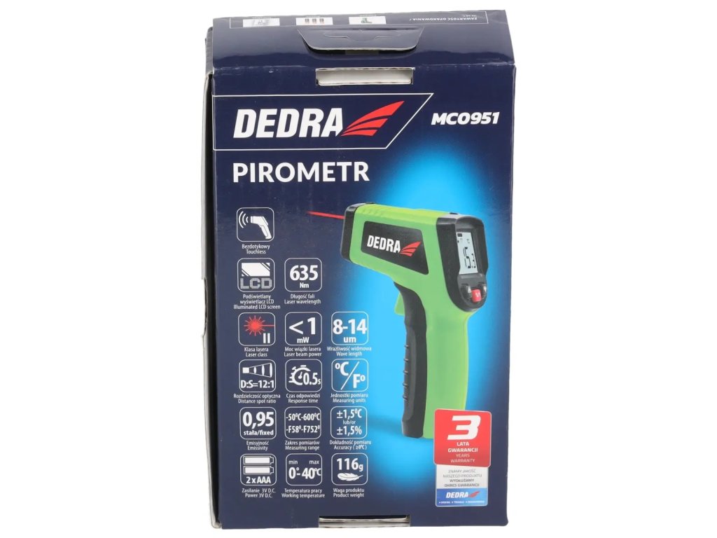 Rozsah merania teploty: -50 až +600 °C; vlnová dĺžka lasera: 635 nm; čas odozvy: 0,5 s; optické rozlíšenie (D:S): 12:1; spektrálna citlivosť: 8-14um; emisivita: 0,95 (konštantná); bezkontaktný; podsvietený LCD displej.