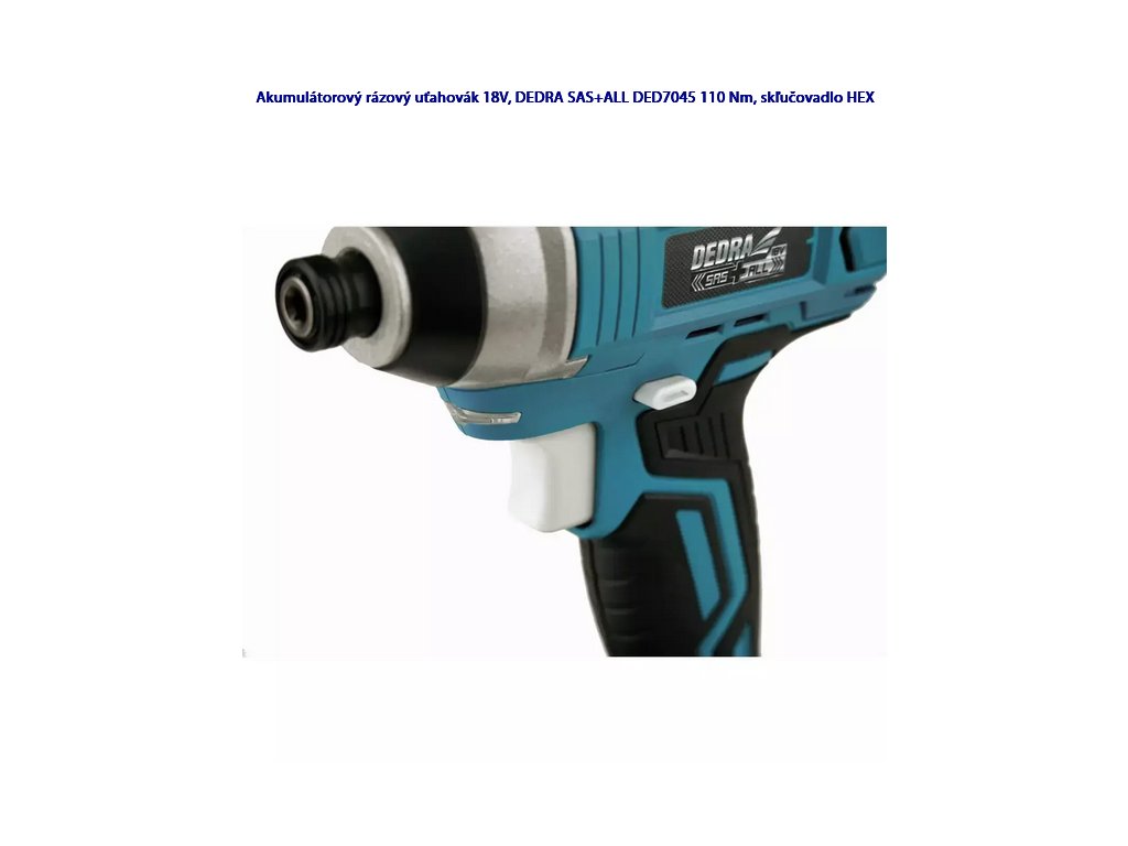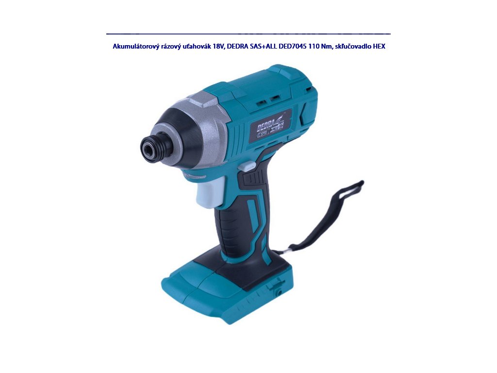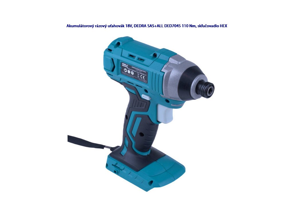 Nástroj, ktorý možno použiť ako na stavbe, tak aj v dielňach. Zariadenie je kompaktné, s malými rozmermi a vysokým krútiacim momentom - 110 Nm. Rázový skrutkovač je ideálny na odskrutkovanie a zaskrutkovanie zaseknutých skrutiek. Rukoväť 1/4" je vybavený dodatočným zámkom navrhnutým tak, aby udržal bit v držiaku a zabránil jeho vypadnutiu počas prevádzky. Akumulátorový rázový uťahovák dobre poslúži aj pri spájaní drevených konštrukcií, ktoré si vyžadujú vysokú uťahovaciu silu. Puzdro je vyrobené z nylonu s prímesou sklolaminátu, vďaka čomu sa zvýšila odolnosť proti mechanickému poškodeniu a UV žiareniu. Ergonómiu a komfort práce zlepšujú nízka hmotnosť prístroja a pogumovaná rukoväť Dodatočné LED osvetlenie vám umožní presne vykonávať prácu na podexponovaných, ťažko dostupných miestach.