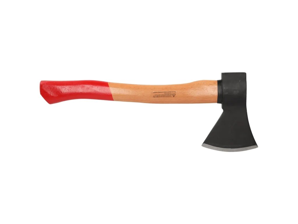 Čepeľ: kovaná uhlíková oceľ; rukoväť: bukové drevo; gumová ochrana čepele; klin