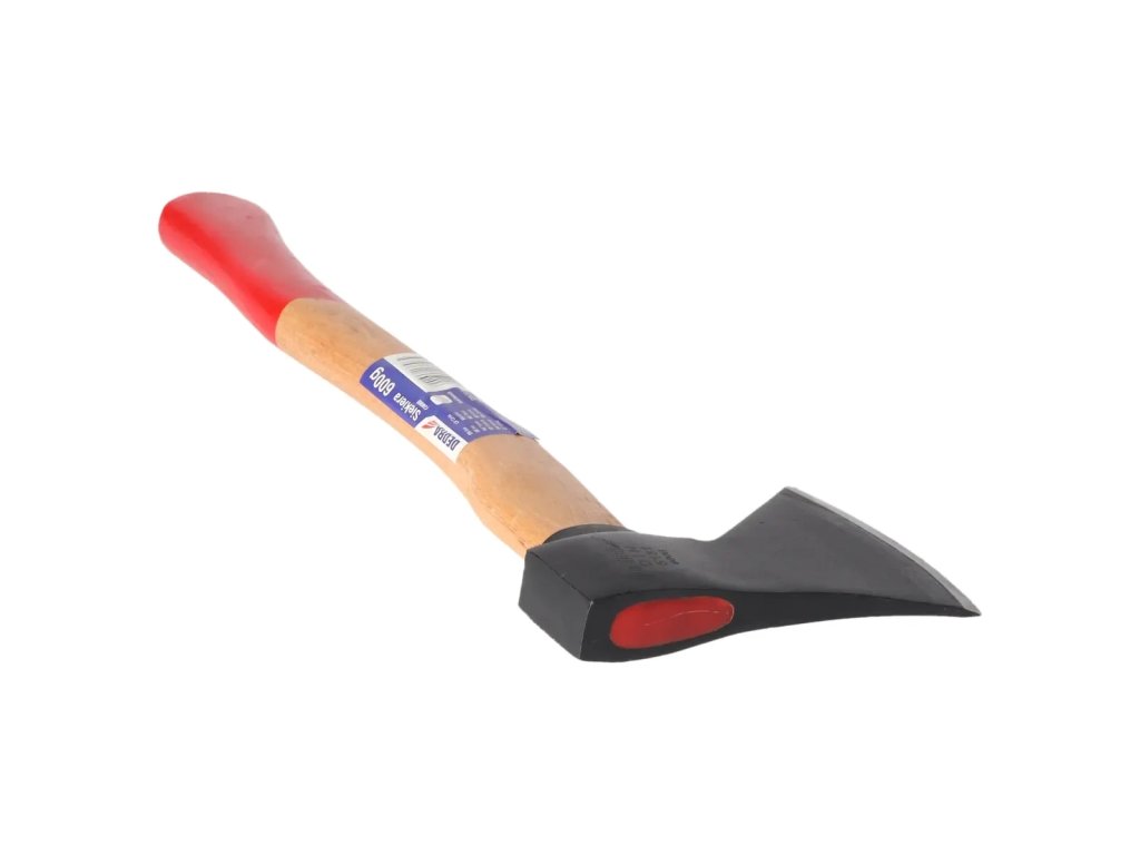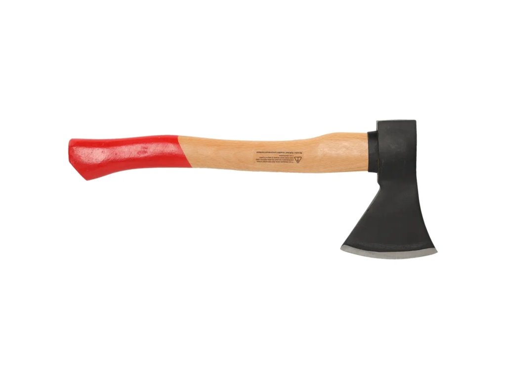 Čepeľ: kovaná uhlíková oceľ; rukoväť: bukové drevo; gumová ochrana čepele; klin