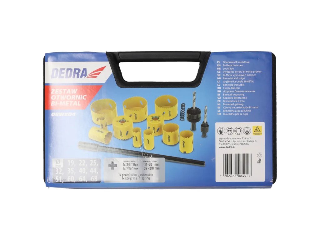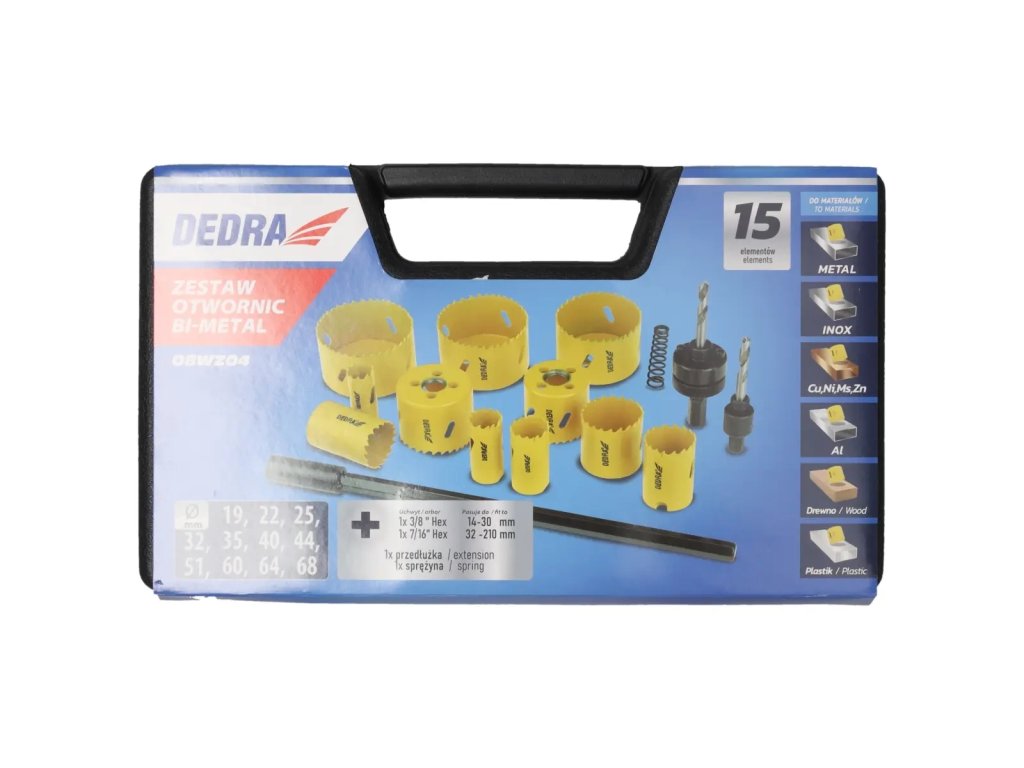 Priemery otvorov: 19, 22, 25, 32, 35, 40, 44, 51, 60, 64, 68 mm, 3/8" rukoväť (14-30 mm), 7/16" rukoväť (32-210 mm), 12" predĺženie pre 7/16" rukoväť, vyhadzovacia pružina