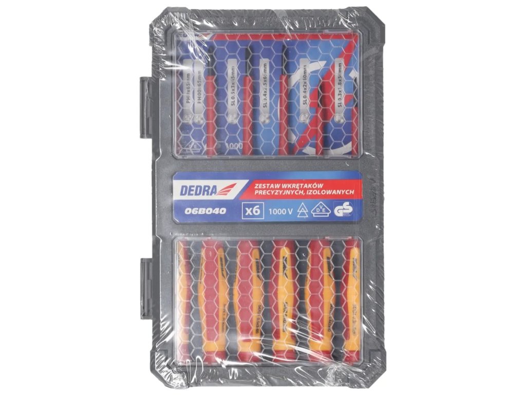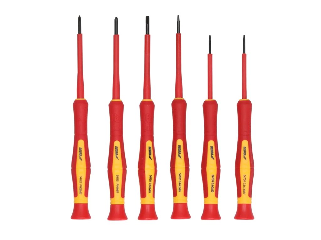 Materiál: oceľ S2 (rukoväť PP+TPR); certifikát VDE 1000V; norma: EN 60900; sada: SL0.3x1.8x50mm/SL0.4x2.0x50mm/SL0.4x2.5x65mm/ SL0.5x3.0x65mm/PH0x65mm/PH00x65mm