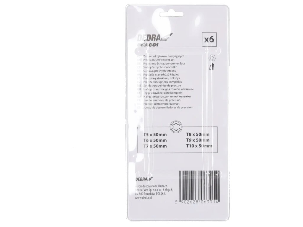 Materiál: CrV oceľ; magnetické bity; plastová škatuľa; sada: T5X50mm/T6X50mm/T7X50mm/T8X50mm/T9X50mm/T10X50mm