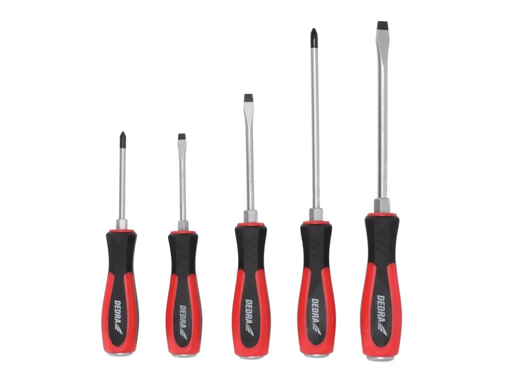 Oceľ CrV; okrúhly hrot, vystuženie hex; veľkosti: ploché: 5x75mm, 6x100mm, 8x150mm, Phillips PH1x75mm, PH2x150mm; magnetická koncovka hrotu; vojkomponentová rúčka s protišmykovým povrchom; kovová nákovka v rúčke