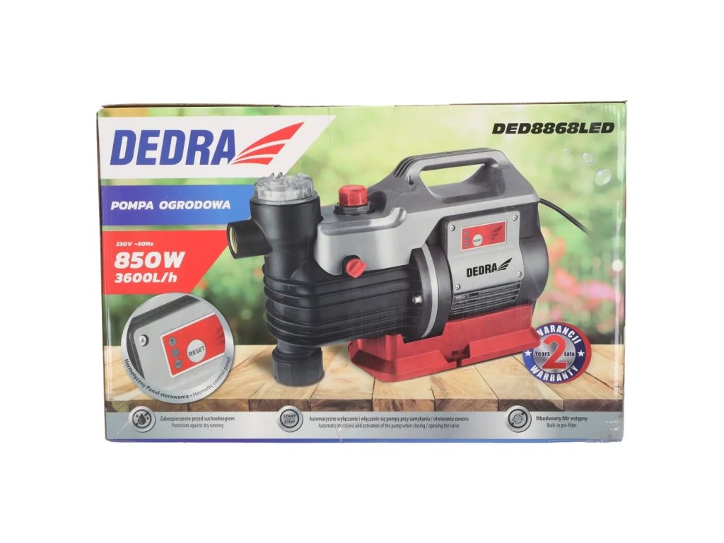 Výkon spotrebiča: 850 W, rukoväť na prenášanie, automatické zapnutie, vypnuté, dĺžka napájacieho kábla: 1,2 m, prietok: 3600 l/h, materiál konštrukcia: hliník, plast, Maximálna hĺbka odsávania: 8, Maximálna výška zdvíhania: 38 m, priemer pripojenia 1", IPX4, Ochrana proti chodu nasucho